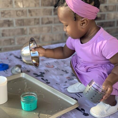 During the warmer months I love to setup simple water pouring stations outdoors. It does get messy but it’s just water, and its outdoors.